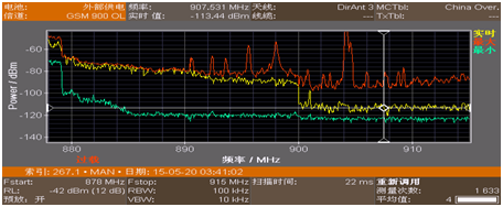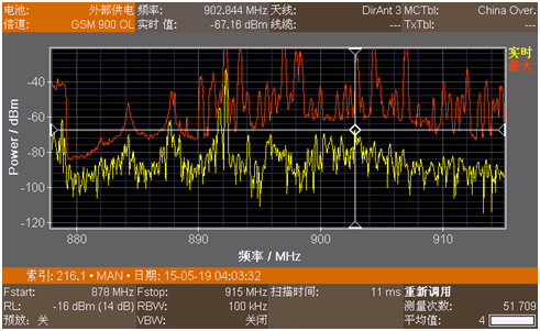 在燕郊夏威夷花園二期大門口,打開IDA2干擾分析儀,設(shè)置成GSM頻段,轉(zhuǎn)動定向天線進行掃描測試,沒有發(fā)現(xiàn)異常信號。沿著小區(qū)內(nèi)道路行進,到達第二棟樓時頻段內(nèi)本底噪聲開始抬升,懷疑此處有非法放大器存在,沿該樓查找并將定向天線抬高傾斜度指向高層,發(fā)現(xiàn)全頻段信號變化明顯,見下圖。