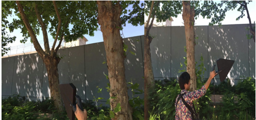 隨后我們沿著小區(qū)道路繼續(xù)查找其他干擾信號,到達第五棟樓時,儀表本底噪聲又開始抬升,我們攜帶IDA2干擾分析儀轉(zhuǎn)到該樓后面時發(fā)現(xiàn)信號明顯變?nèi)?,判斷干擾源應(yīng)該在該樓前面,我們快速步行到該樓前面,在兩棟樓之間道路上轉(zhuǎn)動定向天線查找強信號,發(fā)現(xiàn)前面樓信號更為強烈。使用定向方法確認干擾源位置見圖4.