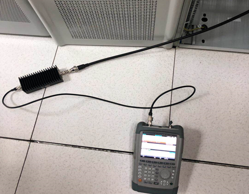 現(xiàn)場測試GSM-R發(fā)射機采用的設備為基站綜合測試儀FSH4及30dB同軸衰減器,現(xiàn)場連接圖如下所示: