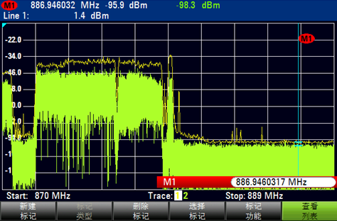 通過使用頻譜儀對現(xiàn)場無線電環(huán)境進行測試,在該點對GSM-R上行頻段885MHz-889MHz進行頻譜掃描和底噪監(jiān)測后發(fā)現(xiàn),該點GSM-R上行本底噪聲在-98.3dBm左右,并未發(fā)現(xiàn)明顯干擾問題,同時監(jiān)測當前區(qū)域內(nèi)中國電信CDMA基站信號發(fā)射情況,也不存在電信信號拖尾或者大功率雜散對GSM-R上行的干擾,具體測試頻譜圖參見下圖: